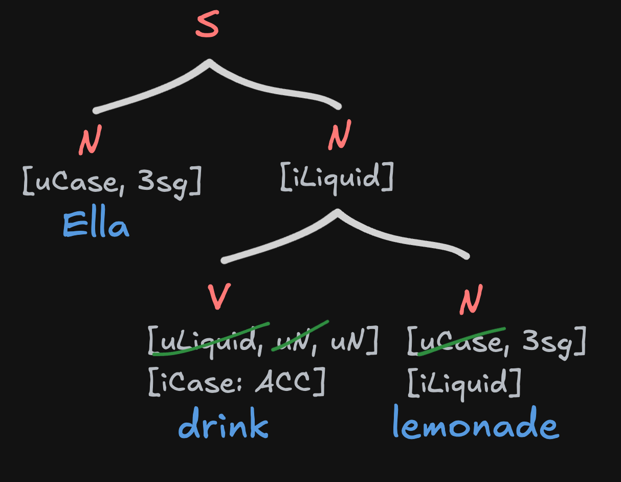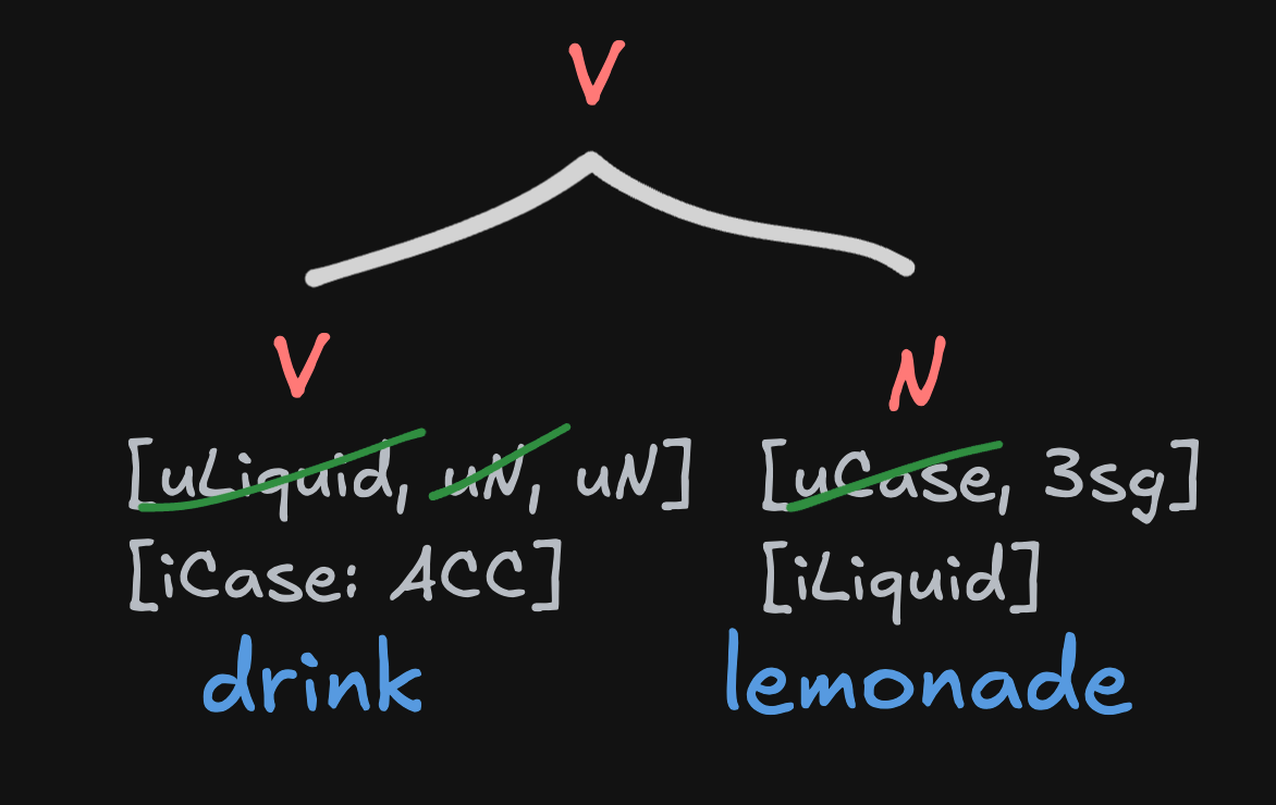 For example, in order for the uninterpretable feature [liquid] of drink to go away, it needs to combine with something that has the interpretable feature [liquid]. In fact, merging drink and lemonade has multiple benefits: it gets rid of the uninterpretable feature [liquid] feature on drink, the uninterpretable [Case] feature on lemonade, and one of the uninterpretable [N] features on drink.