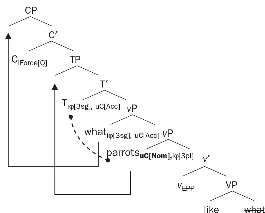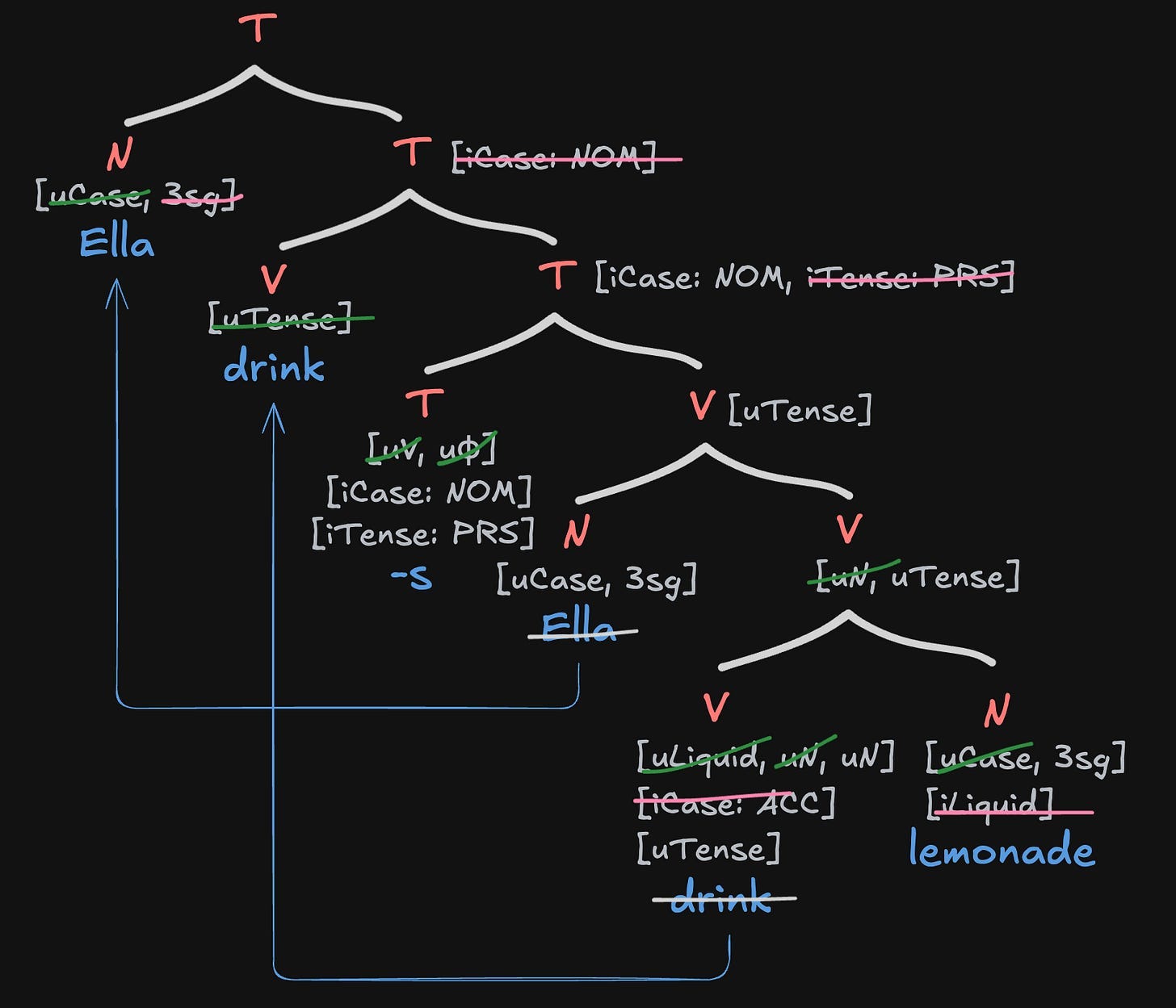 Unfortunately, this doesn’t explain why we need to move drink up closer to the tense marker—the verb phrase Ella drink lemonade has a [uTense] feature, and its sister has a [iTense] feature. Why can’t they combine right when the tense marker first merges in?