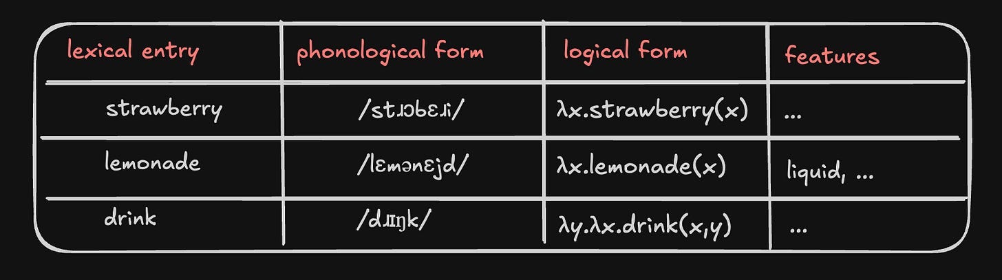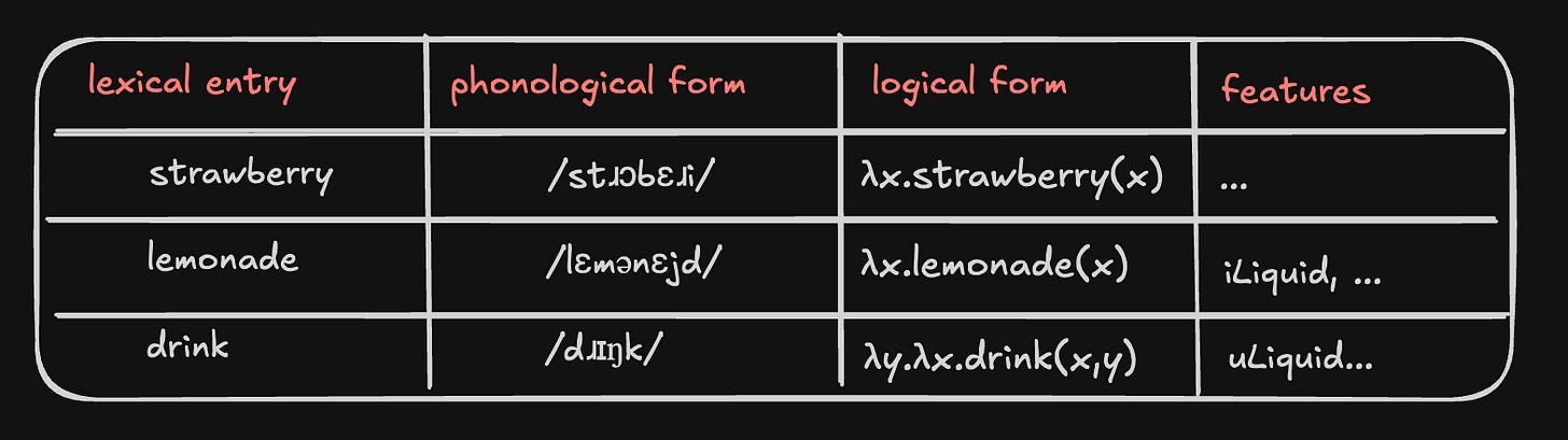 We said that lemonade had the [liquid] feature, and strawberry didn’t, and that’s why drink could take lemonade but not strawberry as an object. But where does it say that—how do we formally represent that drink can only take objects with the [liquid] feature?