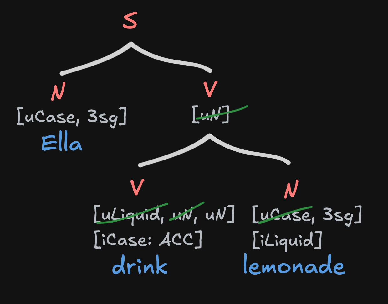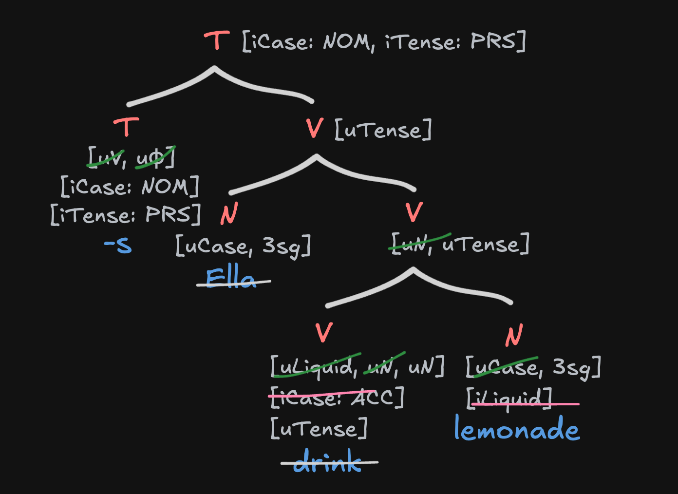 When an uninterpretable feature gets deleted, the interpretable feature basically takes its place. At the end of the derivation of drink lemonade, lemonade will have ACC (accusative case)—which in many languages is marked overtly.