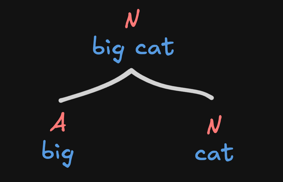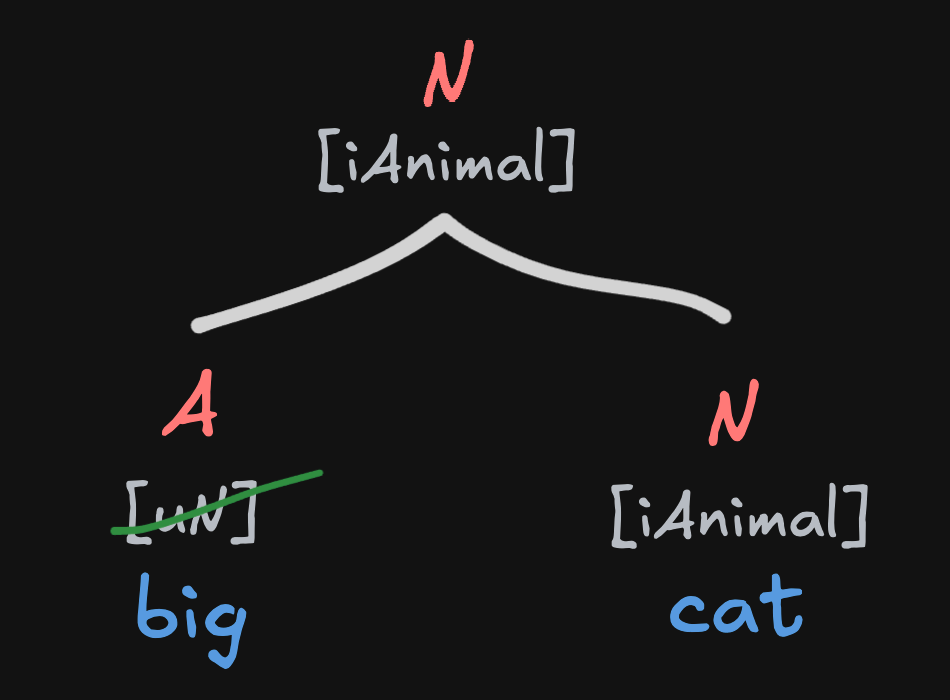 For example, it seems intuitively clear to me that big cat should be a noun and an animal, not an adjective. That suggests that the features of cat should project, not those of big. So maybe the rightmost item in a merge always projects its features to its mother node?