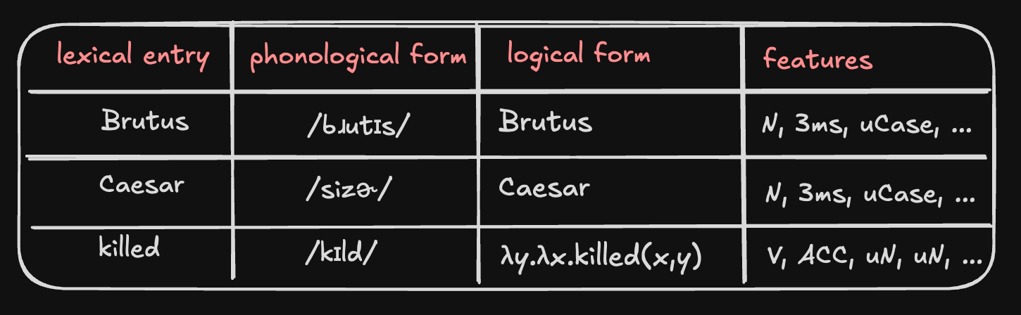 Let’s say we are a speaker who wants to say Brutus killed Caesar.1 This meaning has two entities (Brutus and Caesar) and one event (killed). We need to put them together somehow.
