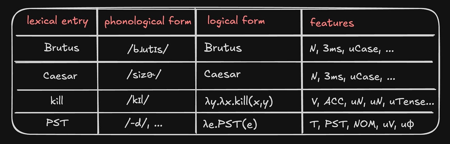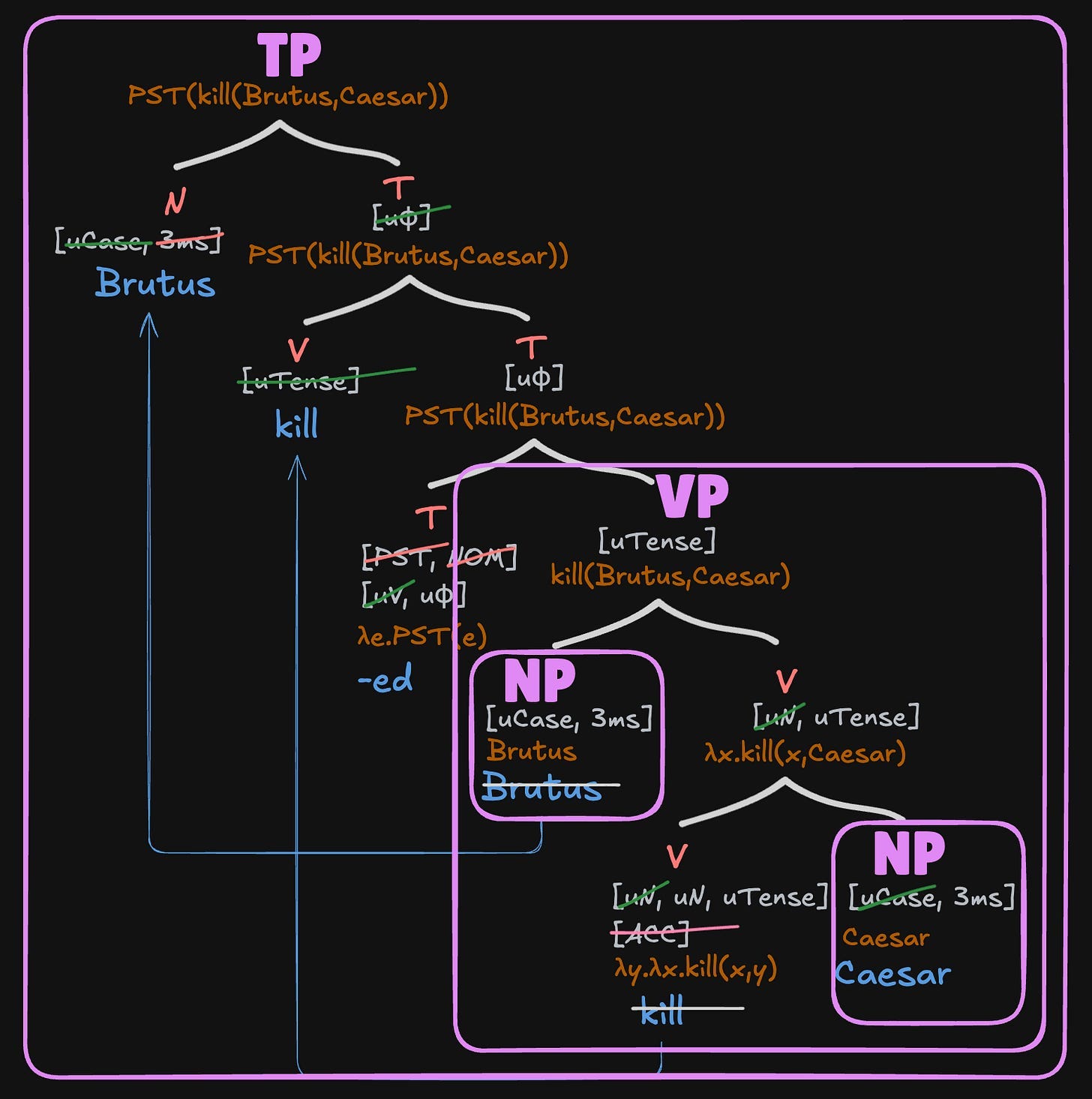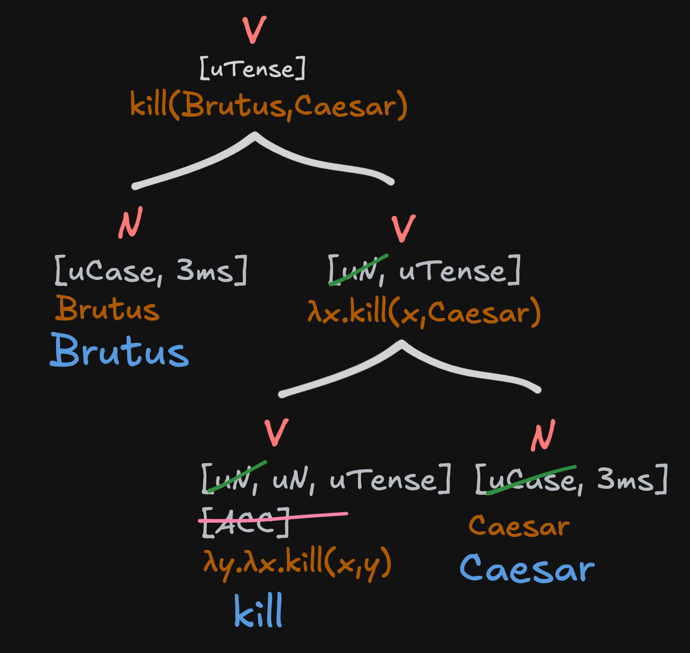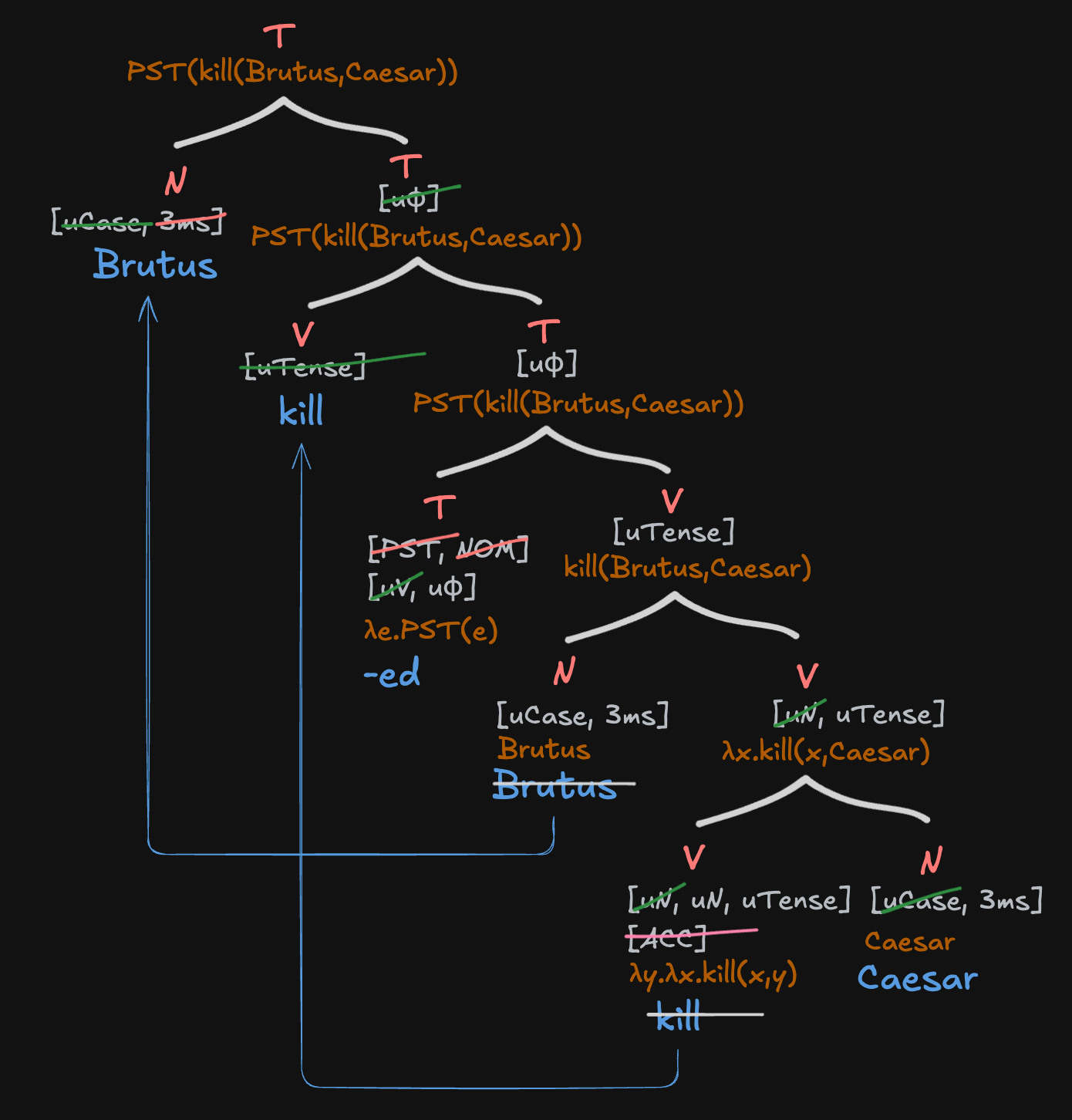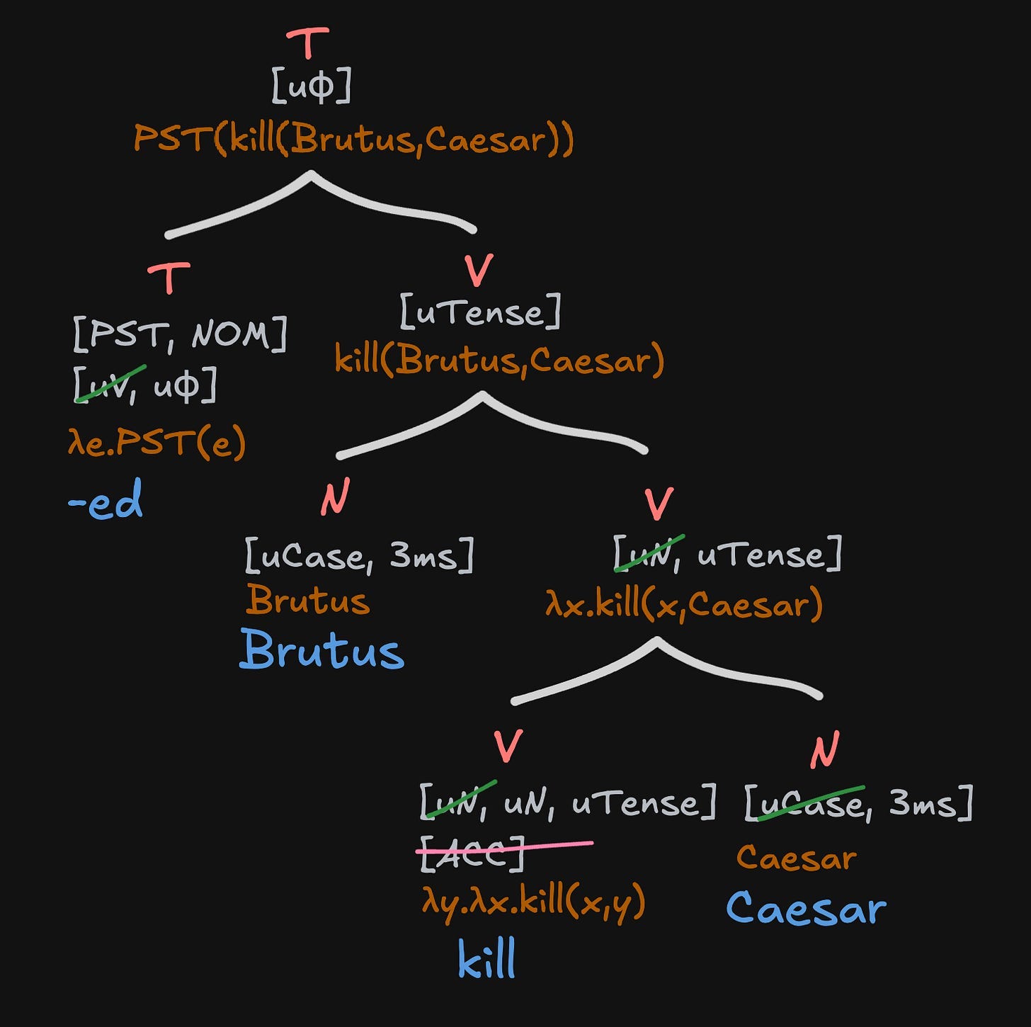What’s new here are the brownish orange logical forms. Especially the one up top, at the merged node. But it’s really simple—all we did is plug the entity/variable Caesar into the event/function λy.λx.kill(x,y). Remember that λx.y means ‘take x, and return y’. So λy.λx.kill(x,y) means ‘take y, and return λx.kill(x,y)’. And that’s exactly what’s happening! The function is taking Caesar and returning (in the higher node) λx.kill(x,Caesar). If this is hard to wrap your head around, just try doing it yourself. Basically, every time you merge two syntactic objects (nodes), you plug one of them into the other.