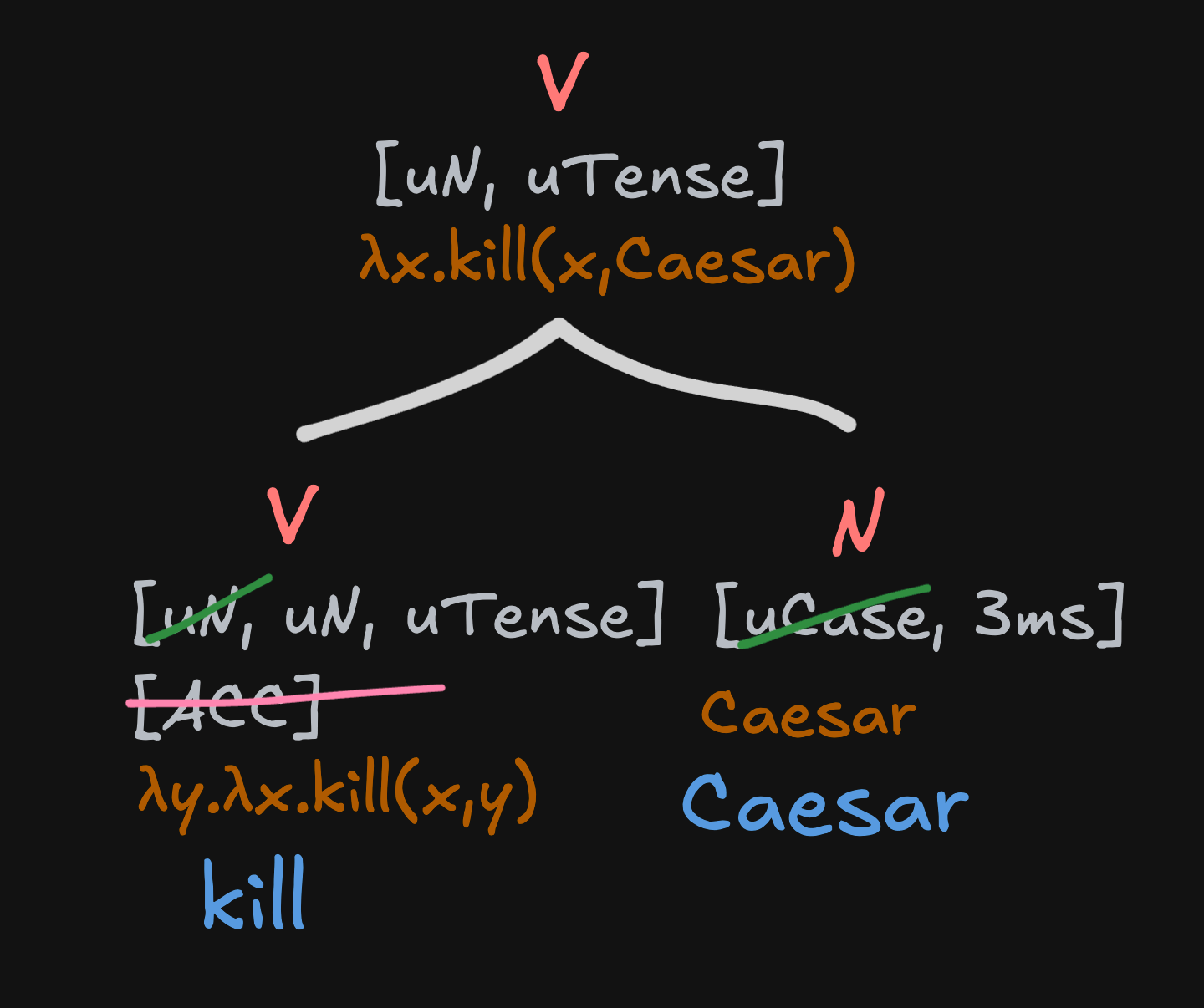 This is an arbitrary rule; what matters is that Caesar is merged first, rather than the latter input being merged first—we could just as easily say the former input is merged first, and represent kill as λx.λy.kill(x,y). Why do we need to merge Caesar first? Because there's a lot of evidence that objects come ‘lower’ in the tree than subjects cross-linguistically – for example, subjects bind objects and not the other way around (we'll get to binding later, but basically you can say Caesar killed himself and not Himself killed Caesar), and objects are much more likely to form idioms with verbs.